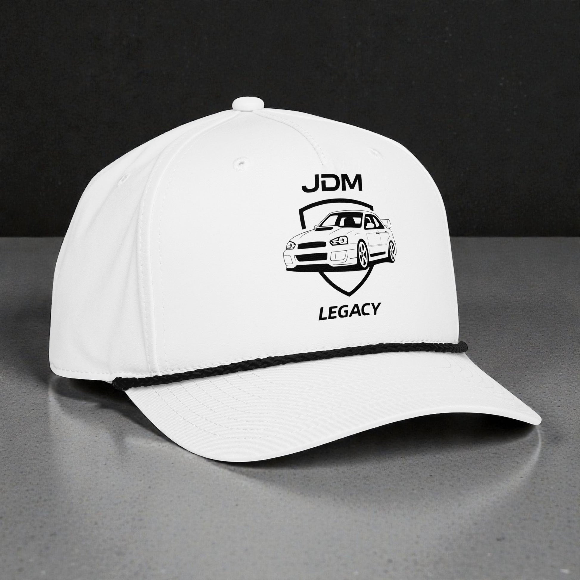 A tribute to the rumble that defined an era. This hat features a clean, technical silhouette of the iconic rally-bred sedan, centered perfectly between our signature "JDM" and "Legacy" branding. The minimalist sketch captures the aggressive hood scoop and unmistakable high-rise spoiler profile of the legendary EJ20-powered machines.