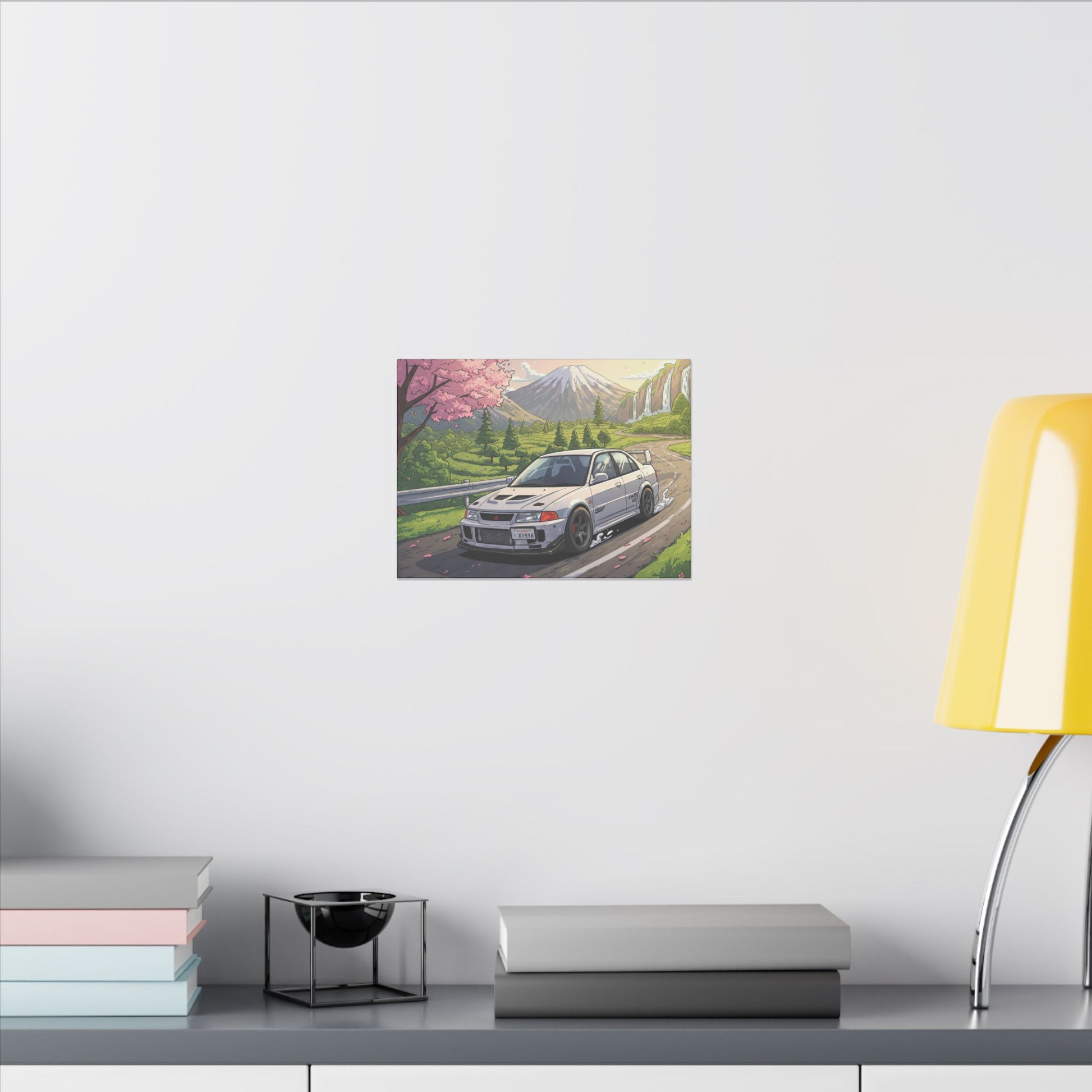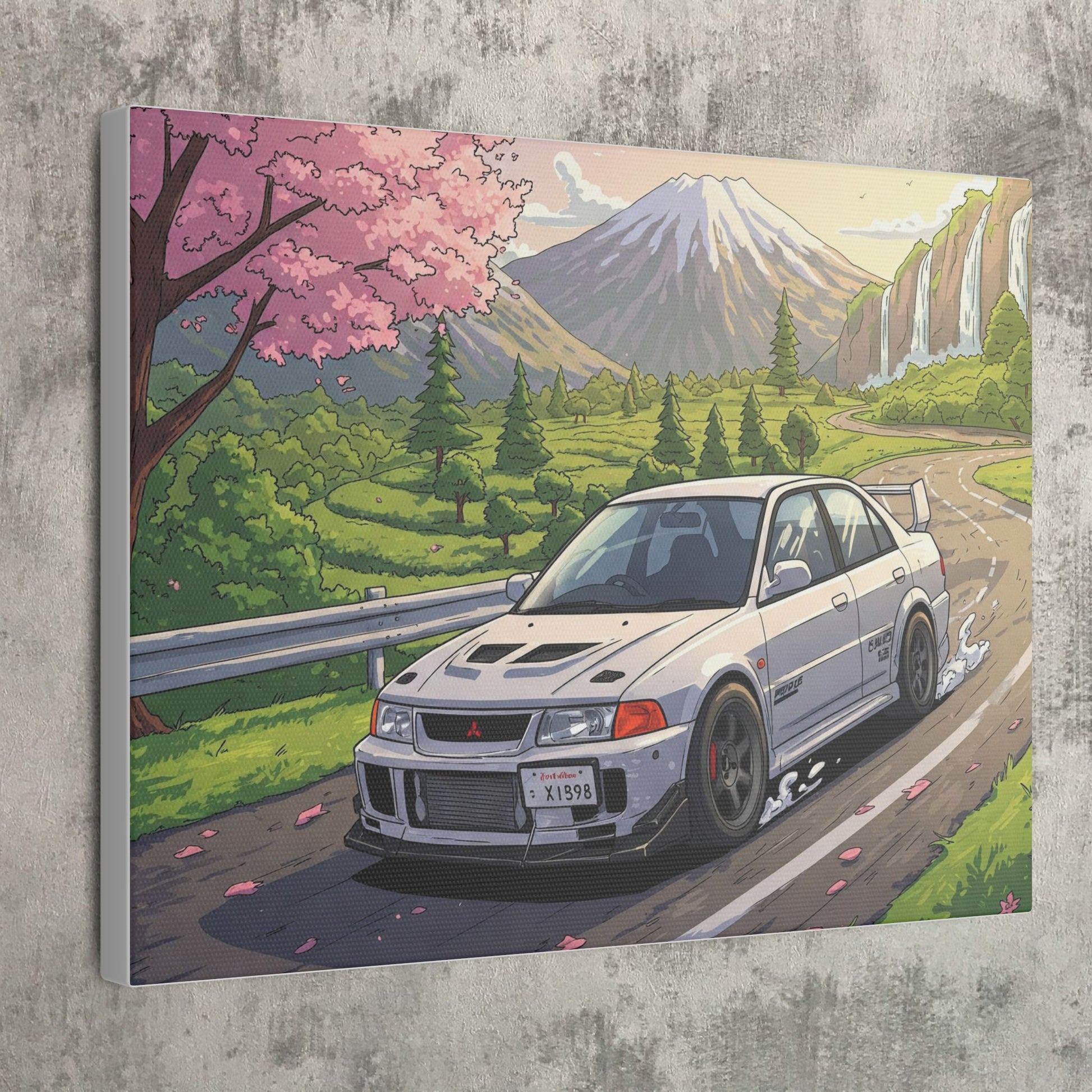 A vibrant canvas print featuring a JDM Evo cruising through the mountains of Japan. Perfect for car enthusiasts or fans of Japanese culture. Ideal for home decor, office spaces, or as a gift for someone who loves cars from Japan. Grab yours today!